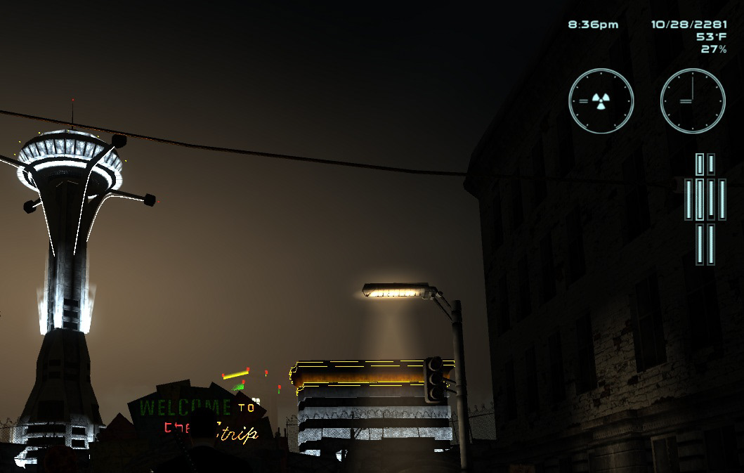 This screenshot shows gauges and readouts added to Fallout: New Vegas’ heads-up-display by the user interface mod HUD Extended, available free for PC versions of the game on Nexus Mods. The graphical elements were drawn in Adobe Photoshop, and integrated into the game via Bethesda’s Garden of Eden Creation Kit (G.E.C.K. SDK) and hand edits to the game’s UI .xml files. The two dial gauges show a character’s irradiation level, and the current time. The collection of bar gauges below them compliment the game’s traditional health bar by showing information relevant to the game’s location-specific damage system, compactly showing a character’s helmet and armor condition (in bold) alongside individual limb health bars.