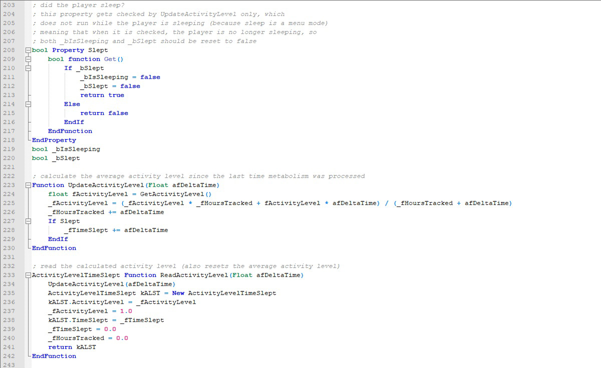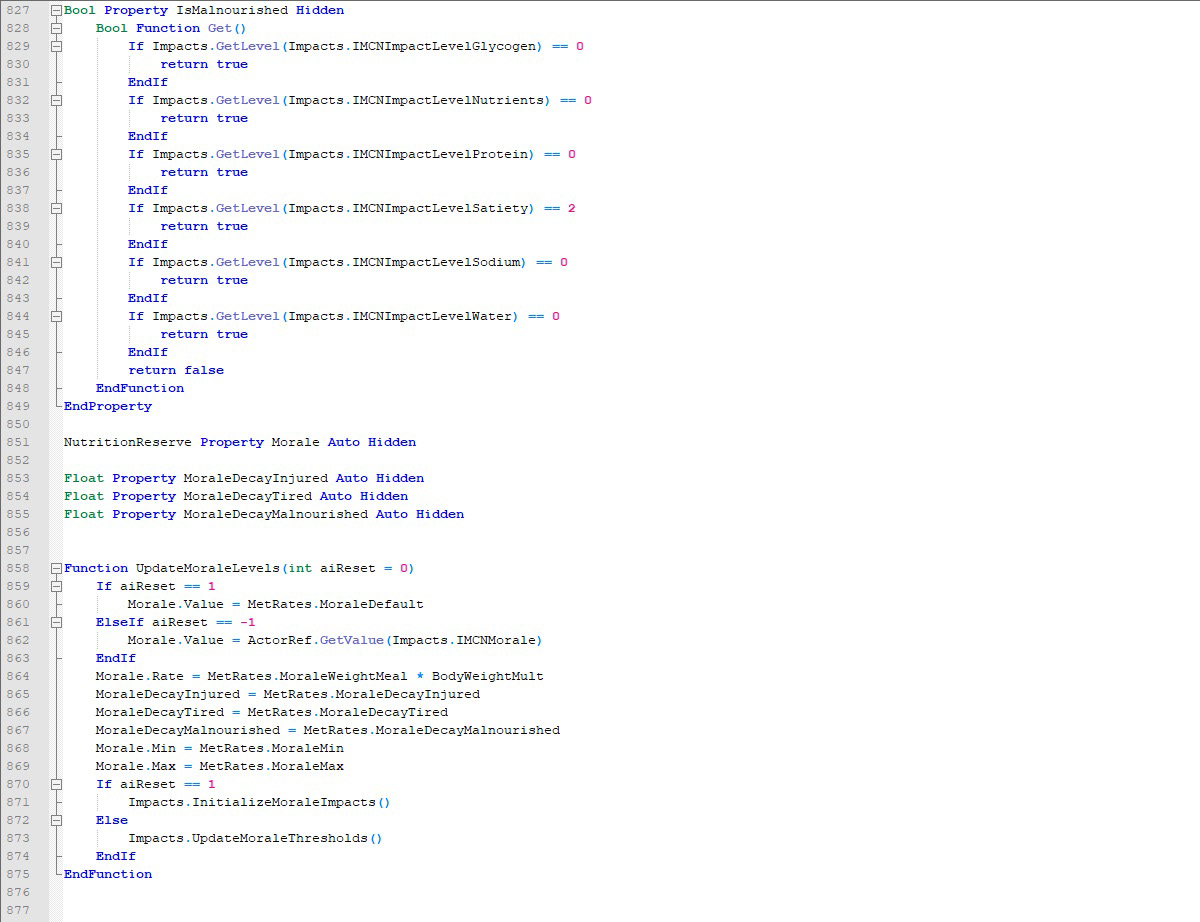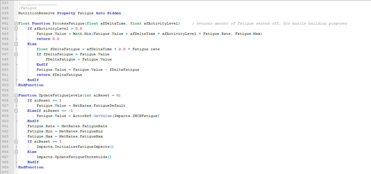 Papyrus is an object-oriented scripting language used by the recent Creation Kit-based Bethesda role playing games, The Elder Scrolls V: Skyrim and Fallout 4. I have made extensive use of it while creating mods for these games. The following script is the core of the Fallout 4 version of Imp's More Complex Needs, a hunger/thirst/sleep simulator that realistically models physiology, applying it to both the character and their currently active companion, making them require food, water, and rest to stay healthy. An instance of the script is attached to the player and to their currently active companion. It processes their metabolism and applies penalties and bonuses based on the resulting statistics.
